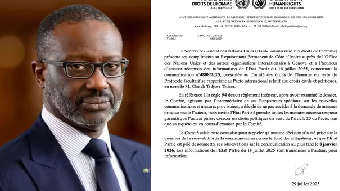 Selon Me Chichportich, le Comité des droits de l’Homme des Nations Unies invite « l’Etat à +prendre toutes les mesures nécessaires pour garantir que M. Cheick Tidjane Thiam puisse exercer ses droits politiques en vertu de l’article 25 du Pacte+ », garantissant notamment le droit de voter, d’être élu et d’accéder aux fonctions publiques de son pays.