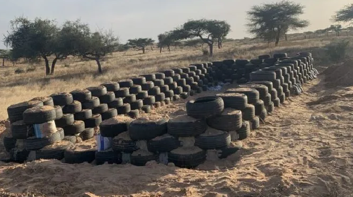 L’ingénieur en génie civil chargé des travaux, Ibrahima Diagne, explique qu’après la fondation, un mur de pneus de deux mètres sera érigé pour servir de clôture au hangar écologique. La surface intérieure des pneus est également recouverte de plastique. De la latérite est ensuite enduite sur les deux côtés des pneus. Une structure en bois couverte de paille servira de toit au hangar. Cela permet d’avoir une certaine fraîcheur à l’intérieur.